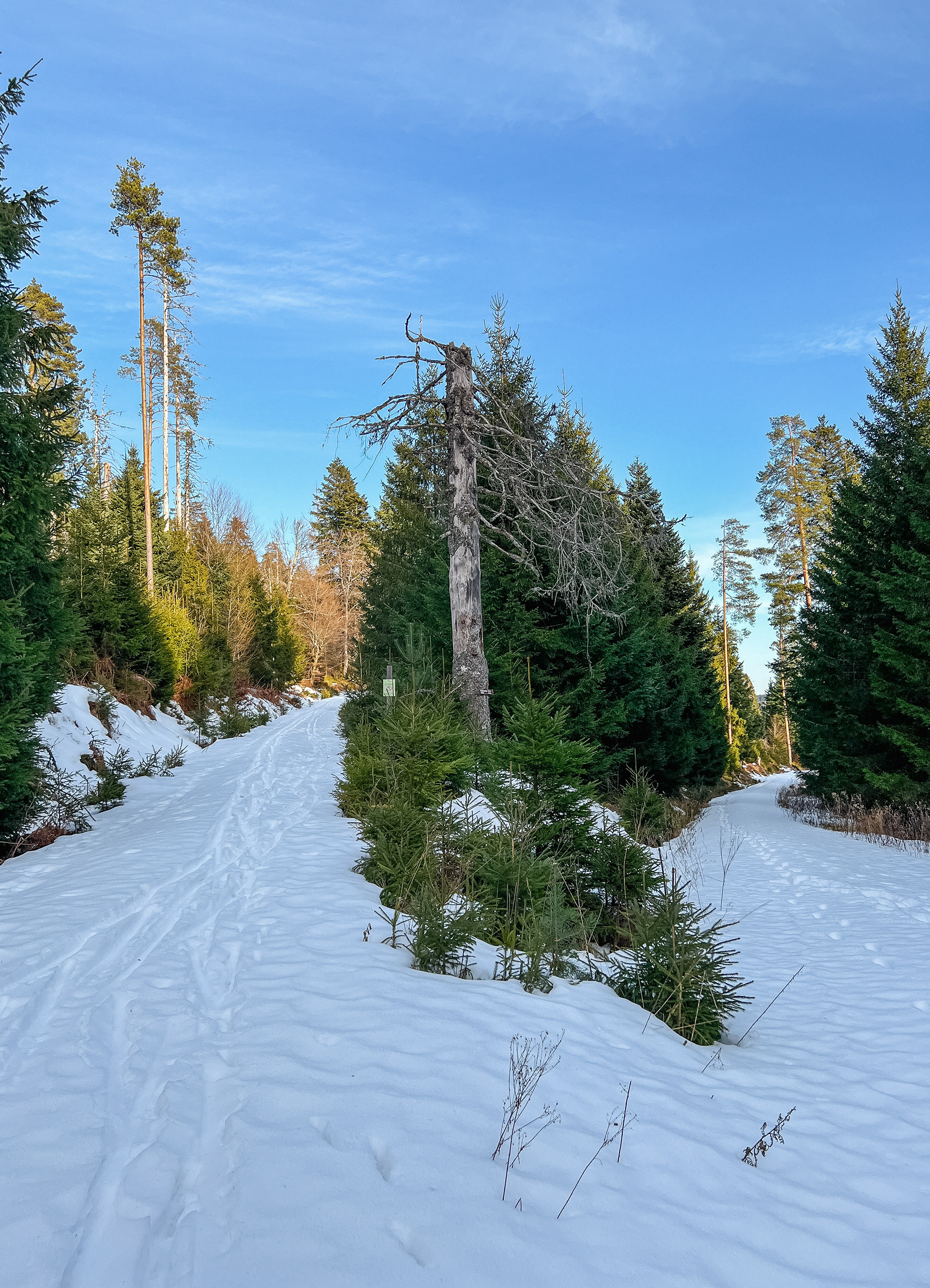 Am Donnerstag Nachmittag war meine bisher heftigste Wanderung angesagt. Man kann Wege und Pfade nur kontrollieren, wenn man darauf unterwegs ist, und das war in der Woche echt viel angesagt. Zumindest für mich als Schreibtischarbeiter und Papa in Elternzeit war das viele Wandern ziemlich anstrengend. Donnerstag vormittag ca. 6km, am Nachmittag nochmal 11km. Mit der Nachmittagswanderung waren die 60km in vier Tagen voll. Im Schwarzwald, bei Schnee und Eis. Für die letzten zwei der 11km hab ich eine Stunde gebraucht, ich war platt. So richtig. War trotzdem cool. Tierspuren, angeknabberte Pflanzen und ständig wechselnder Schnee-/Eis-/Matsche-Untergrund. Und in guter Gesellschaft geht das dann schon irgendwie. An dieser Stelle auch nochmal vielen Dank an Lukas für seine Geduld und gute Laune!
